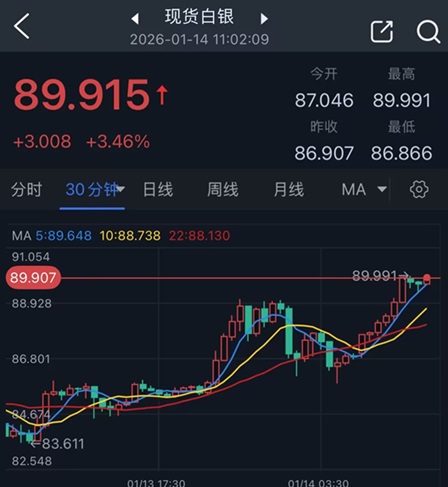 現貨白銀價格暴漲3.5%,觸及89.99美元/盎司;黃金價格則交投於接近歷史最高水平的位置。鉑金和鈀金也同步走高。