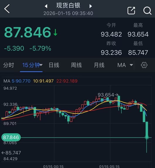 24K99訊 週四(1月15日)亞市盤中,現貨白銀突然暴跌,銀價目前剛剛跌破88美元/盎司,日內暴跌近6%。分析師指出,特朗普最新舉動以及投資者獲利了結成爲銀價突然猛烈回調的主要原因。