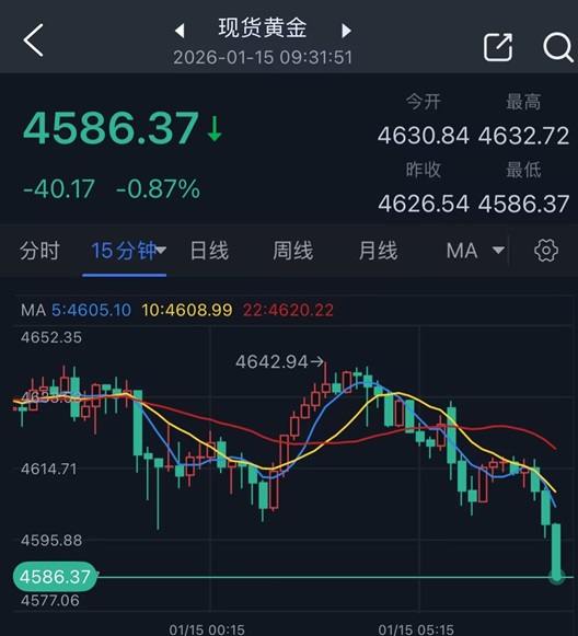 受白銀暴跌拖累,黃金價格也快速下滑。現貨黃金目前跌至4586美元/盎司附近,日內大跌40美元。鉑金和鈀金也走低。