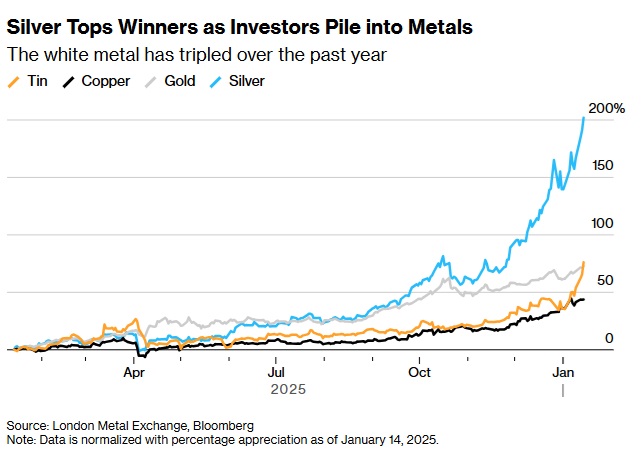 週三,一輪大範圍金屬上漲推動白銀和黃金刷新歷史高位,銅和錫也同步創下新峯值;在地緣政治、供應端以及關稅不確定性加劇之際,投資者轉向硬資產避險。中國和美國的瘋狂買盤,以及更廣泛的資金輪動流入大宗商品,共同提振了這一板塊。
