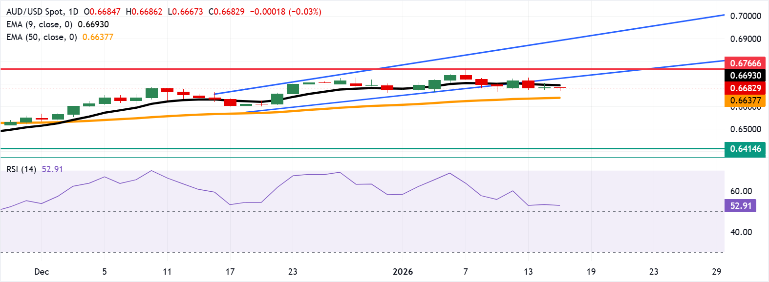澳元/美元在週四歐洲時段保持穩定,交易在0.6680附近,連續第二個交易日如此。日線圖的技術分析顯示,隨著該貨幣對略微低於上升通道模式,看漲偏向減弱。