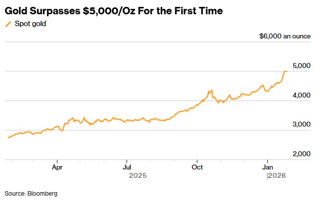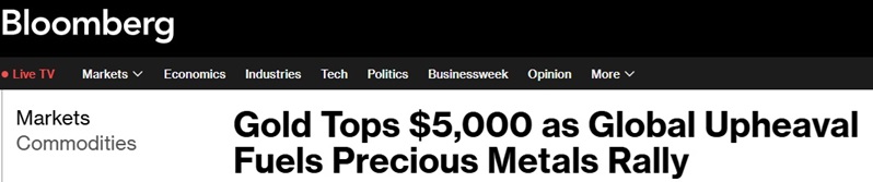 美國彭博社分析稱,黃金價格首次突破5000美元/盎司,延續了由美國總統特朗普(Donald Trump)重塑國際關係以及投資者逃離主權債券和貨幣所推動的急劇上漲。