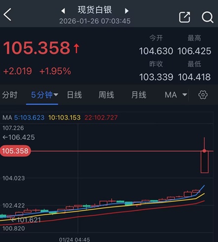 週一,白銀也創下了歷史新高。銀價一度突破106美元/盎司大關,最高觸及106.425美元/盎司。