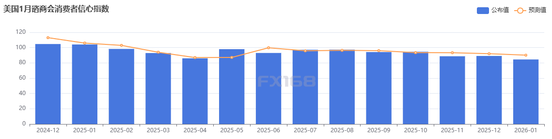 諮商會週二表示,1月消費者信心指數降至84.5,顯著低於經濟學家普遍預期的90.9,也低於12月上修後的94.2。本次初步結果的統計截止日期爲2026年1月16日。
