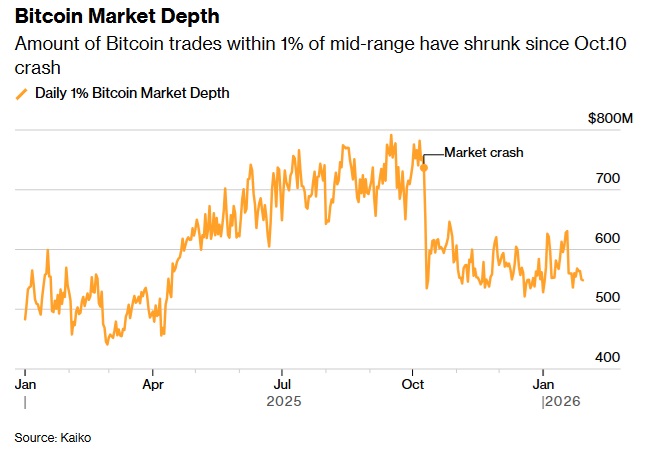 根據Kaiko數據,比特幣的市場深度——衡量可用於吸收大額交易的資金規模——仍比10月峯值低逾30%。流動性上一次下滑到如此程度,還是在2022年FTX倒閉之後。