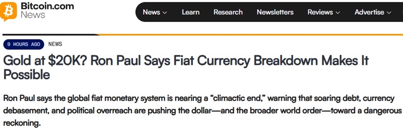 24K99訊 美國政壇大佬羅恩·保羅(Ron Paul)表示,全球法定貨幣體系正接近「高潮末尾」,他警告稱,債務激增、貨幣貶值和政治過度干預正在將美元——以及更廣泛的世界秩序——推向危險的清算時刻。