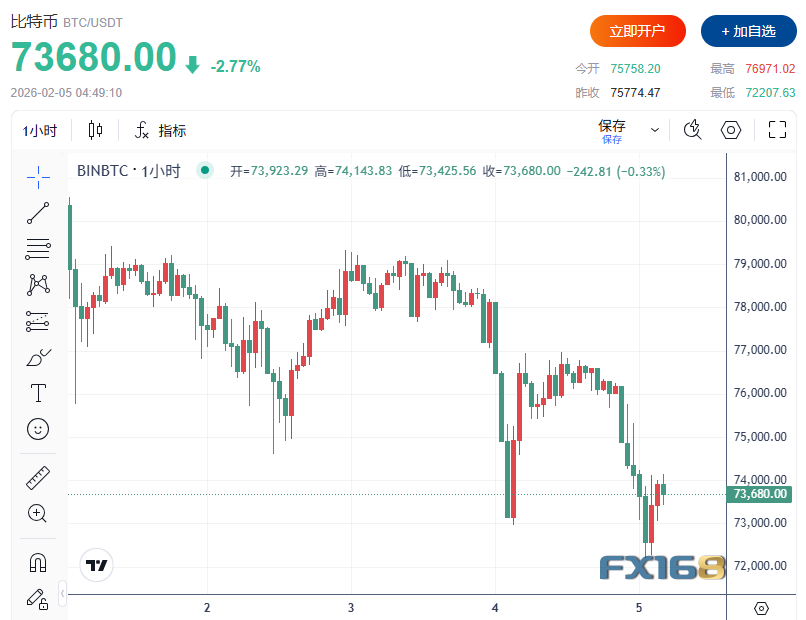 FX168財經報社(北美)訊 比特幣(BTC)週三(2月4日)延續本週大幅回撤行情,盤中一度下探至約72096美元附近,日內跌幅超過5%,爲連續第二個交易日顯著走弱。市場人士指出,在地緣緊張、宏觀數據擾動、貨幣政策預期變化以及加密監管推進放緩等多重因素疊加下,資金持續從高風險資產撤離;與此同時,現貨比特幣ETF與機構資金外流進一步壓縮流動性,令價格承壓加劇。