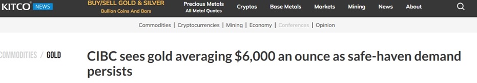 週三(2月4日),加拿大帝國商業銀行(CIBC)的商品分析師發佈更新後的黃金價格預測,預計今年金價均價將達到6000美元/盎司,較其去年10月給出的4500美元/盎司預測大幅上調。