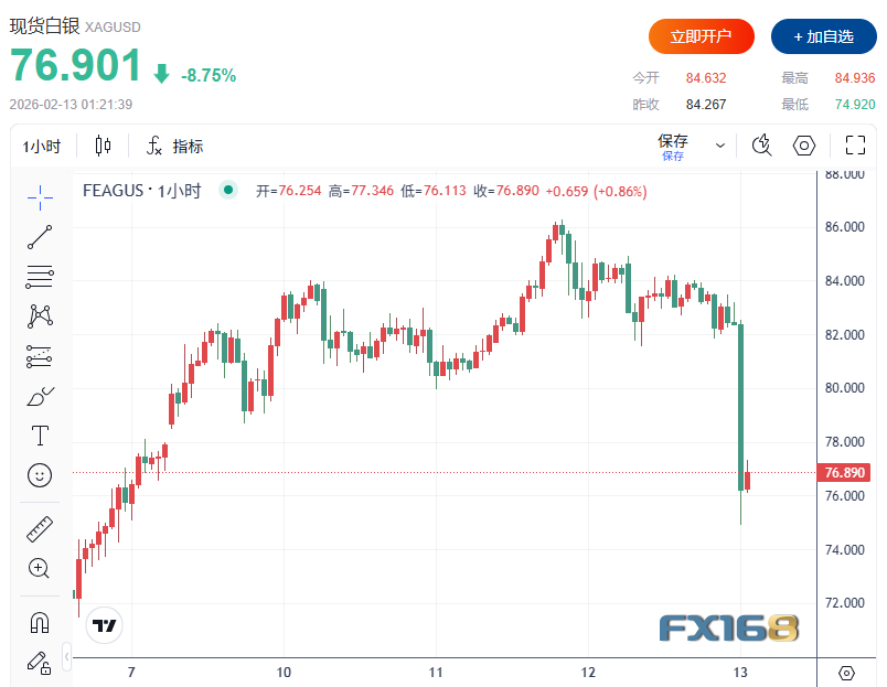 現貨白銀日內重挫8美元,觸及74.92美元/盎司跌幅,跌幅約達10%。