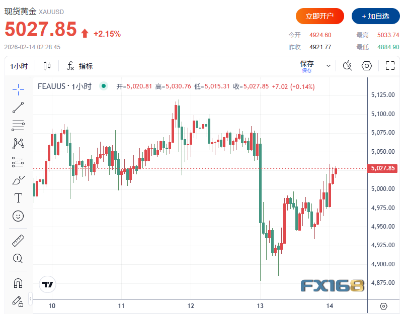 數據出爐後,現貨黃金持續攀升並擴大漲幅至超2.2%,最高觸及5033.74美元/盎司,日內上漲超110美元。週四金價曾下跌約3%,觸及近一週低點。