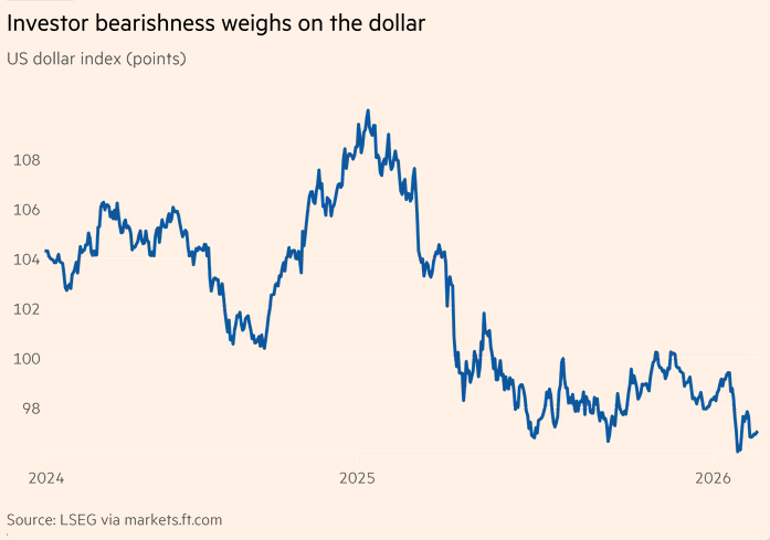 數據顯示,美元今年迄今對一籃子主要貨幣(包括歐元與英鎊)下跌約1.3%,在2025年累計下跌約9%的基礎上繼續承壓,目前徘徊在接近四年低位的區域。