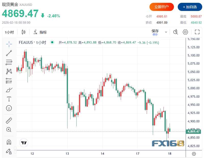 美市盤中,現貨黃金下跌超2.5%,一度觸及4840.02美元/盎司低點。