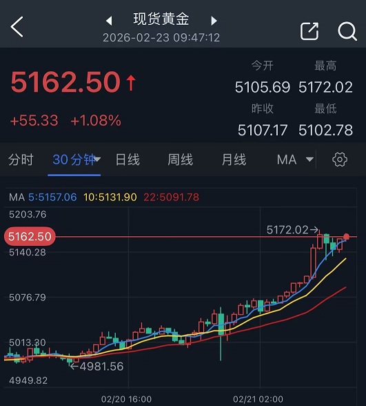 現貨黃金價格週一盤中最高觸及5172.02美元/盎司,日內飆升近65美元。