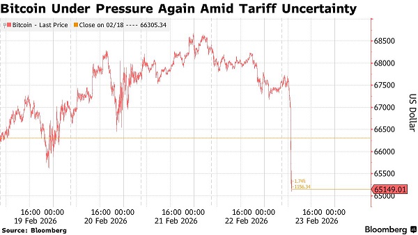 由於美國關稅狀況的不確定性引發了新的緊張情緒,比特幣在週一(2月23日)的亞洲早盤交易中遭遇拋售。