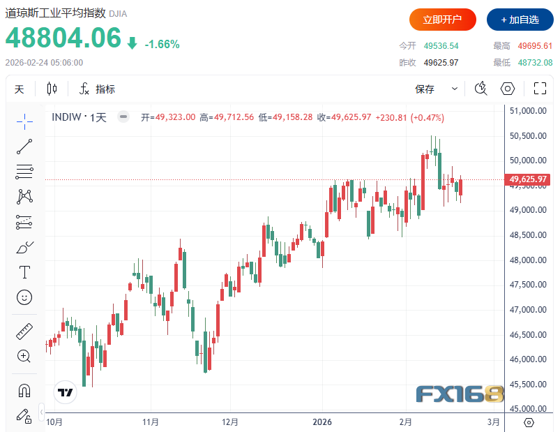 週一收盤,道瓊斯工業平均指數下跌821.91點,跌幅1.66%,報48,804.06點;納斯達克綜合指數下跌1.13%,報22,627.27點;標普500指數下跌1.04%,報6,837.75點,並再度轉爲2026年以來下跌。