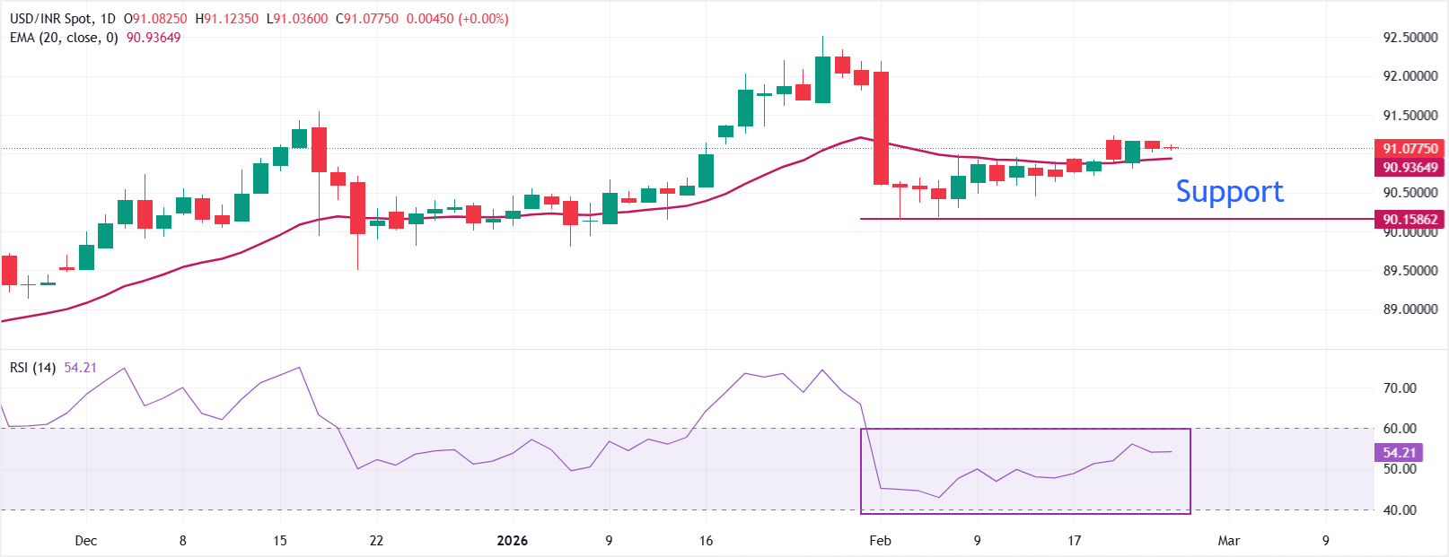 截至發稿時,美元/印度盧比(USD/INR)在91.00附近持平。該貨幣對略微高於20日指數移動平均線(EMA),保持謹慎的看漲偏向,同時上行動能受到限制。價格走勢在月初的激增後已趨於穩定,20日EMA的平坦化反映出一種溫和的趨勢,而非徹底的反轉。