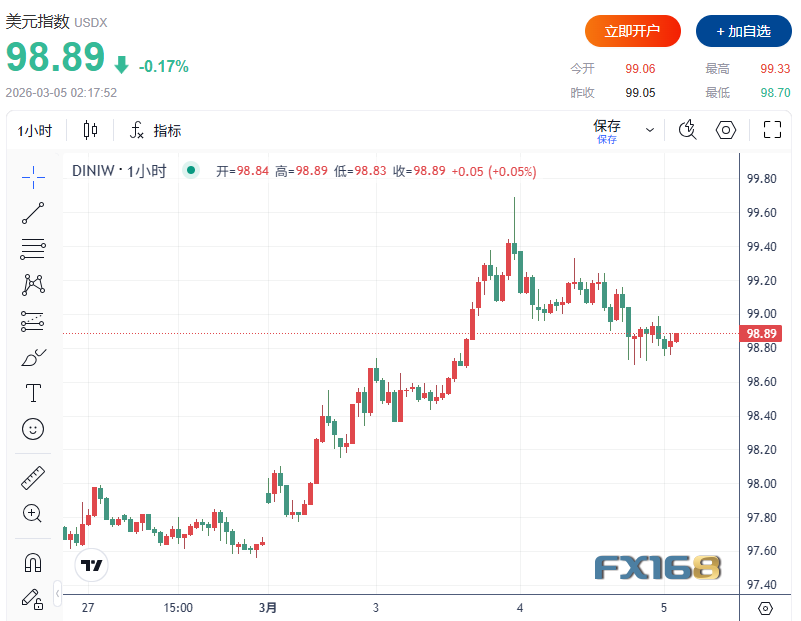 數據顯示,歐元小幅走高至1.1623美元附近;美元指數下跌0.17%至98.89,前一交易日曾觸及自11月28日以來最強水平;美元兌日元下跌0.3%至157.25附近。