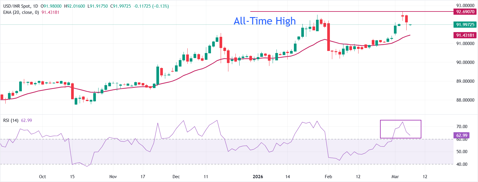 印度盧比(INR)在週五的開盤交易中對美元(USD)走高。美元/印度盧比(USD/INR)跌至接近92.00,因為印度盧比在週四獲得了印度儲備銀行(RBI)在外匯市場干預以應對過度單邊波動所提供的支撐。