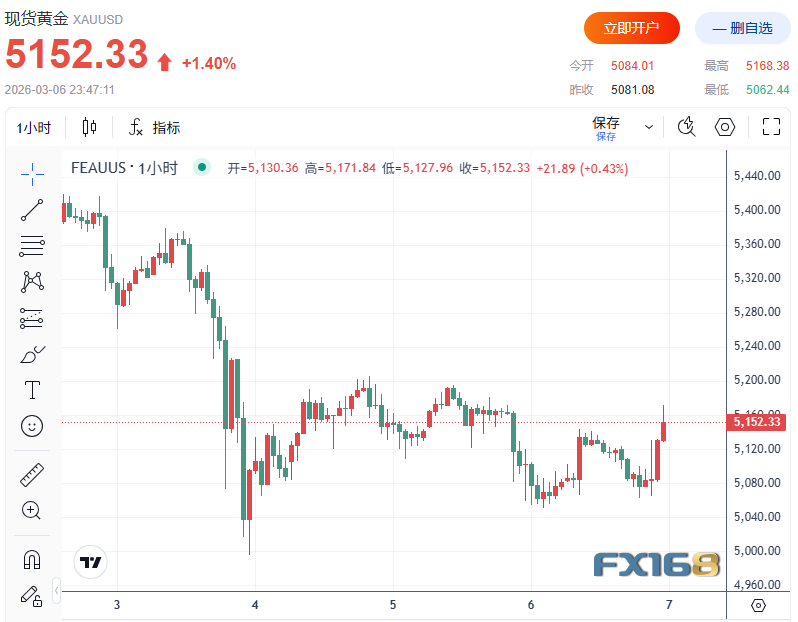 紐約期金日內大漲2.00%,現報5180.40美元/盎司。現貨黃金最高觸及5168.38美元/盎司,日內漲超1.7%或逾85美元。