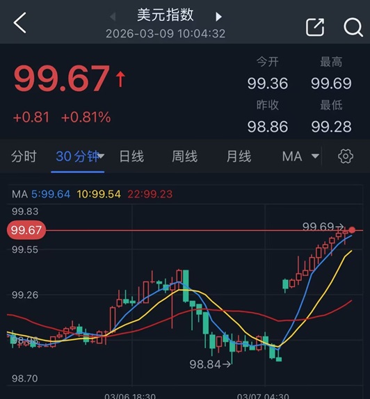 ICE美元指數週一大幅跳空高開,該指數盤中最高觸及99.68,日內飆升逾0.8%。