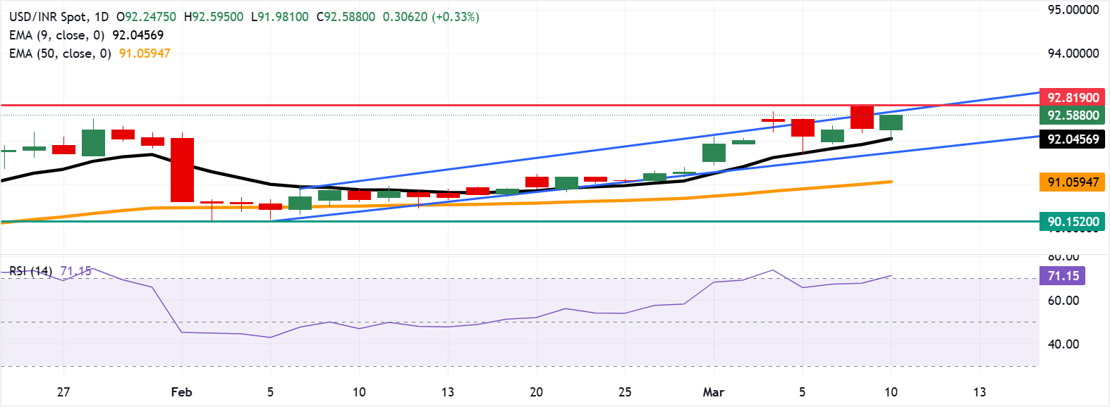 技術分析:美元/印度盧比反彈至92.50,接近歷史高點