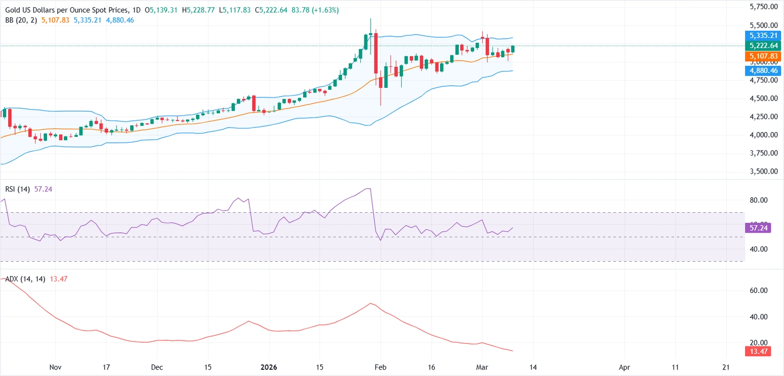 財經網站FXStreet指出,從日線圖來看,黃金短線走勢仍偏溫和看漲,價格穩定在20日布林帶中軌上方,後者位於5105美元附近,目前正充當即時支撐位。若持續跌破這一水平,可能引發更深幅度的回調,目標或指向布林帶下軌附近的4880美元。