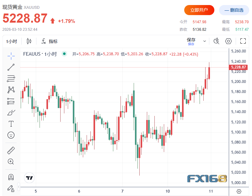 FX168財經報社(北美)訊 週二(3月10日),現貨黃金延續前一交易日自5000美元附近反彈的走勢,在美元回落、美債收益率走低以及美伊衝突持續發酵的共同支撐下維持強勢。儘管油價因停戰預期一度大跌、全球風險偏好短線回暖,但霍爾木茲海峽緊張局勢依然未解,市場避險情緒並未徹底退潮,黃金下方支撐仍然穩固。