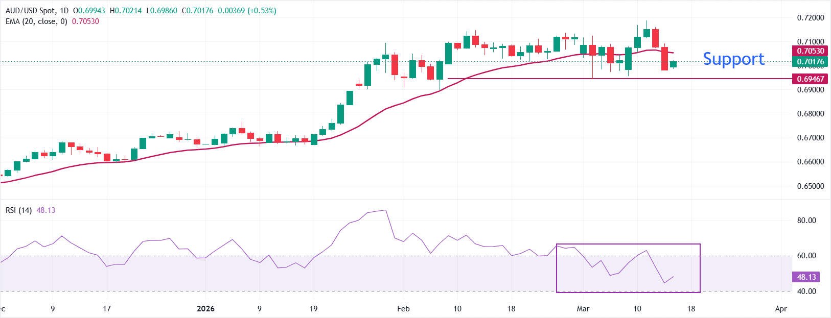 初步阻力位出現在週五的高點附近0.7100,近期的日內高點聚集在上週的0.7120–0.7150阻力位下方。若日收盤價高於該區間,將重新打開通往中間0.72區域的路徑。下行方面,3月3日的低點0.6944是首個支撐位,其次是2月6日的低點約0.6900。若持續跌破後者,將增強向0.6770-0.6800區域更深修正階段的可能性。