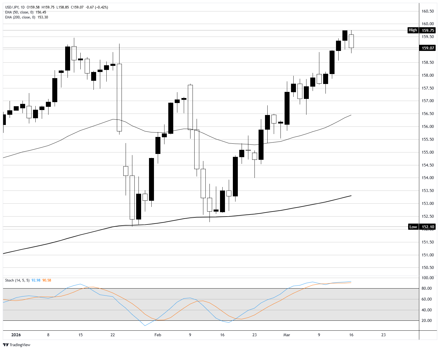 美元/日圓週一回落約0.4%,結束了四個交易日的連勝,回落至159.00區域,市場表現平淡。該貨幣對自2月份接近152.10的低點以來大幅上漲,但週一在近期區間頂部附近的溫和看跌蠟燭表明,159.75的日內高點未能吸引持續的跟進買盤。自2月份以來更高低點的整體模式仍然有效,儘管該貨幣對相對於其關鍵移動平均線明顯被拉伸。