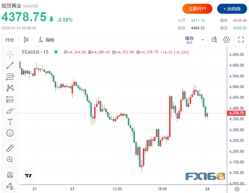 FX168財經報社(北美)訊 週一(3月23日),國際黃金市場出現劇烈震盪行情。在經歷亞洲時段大幅下挫後,金價觸及年內低點並迅速反彈,顯示出逢低買盤入場與市場情緒快速切換的特徵。