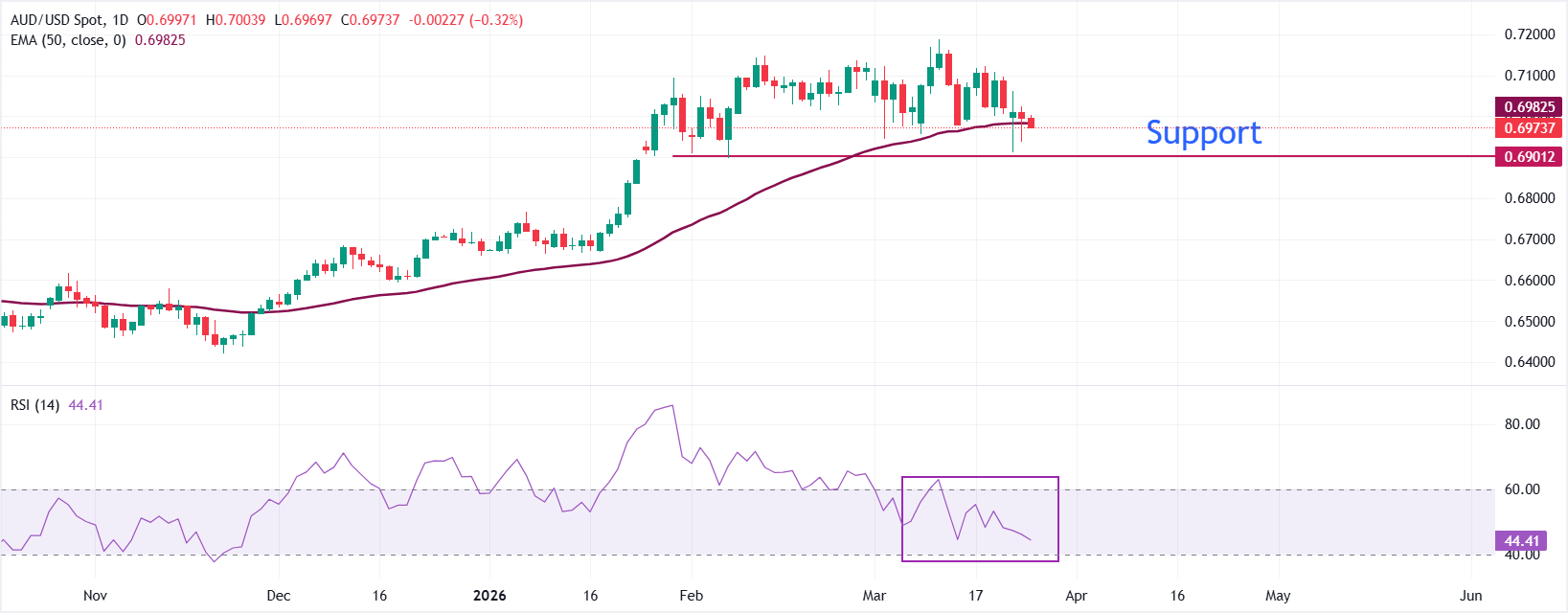 下方初步支撐位於50日EMA附近的0.6950,跌破該位將暴露0.6920及隨後0.6880作為更深層次的回調水平,屬於更廣泛中期反彈中的調整。若明顯跌破0.6880,焦點將轉向更明確的看跌階段,而非盤整。