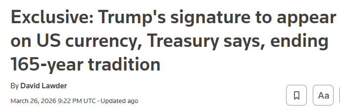 FX168財經報社(北美)訊 美國財政部週四(3月26日)表示,爲紀念美國獨立250週年,未來發行的美元紙幣將印上總統特朗普的簽名。這一舉措將打破自1861年以來延續165年的傳統——美國紙幣上將首次不再出現財政部出納官的簽名,引發市場與政策層面的廣泛關注。