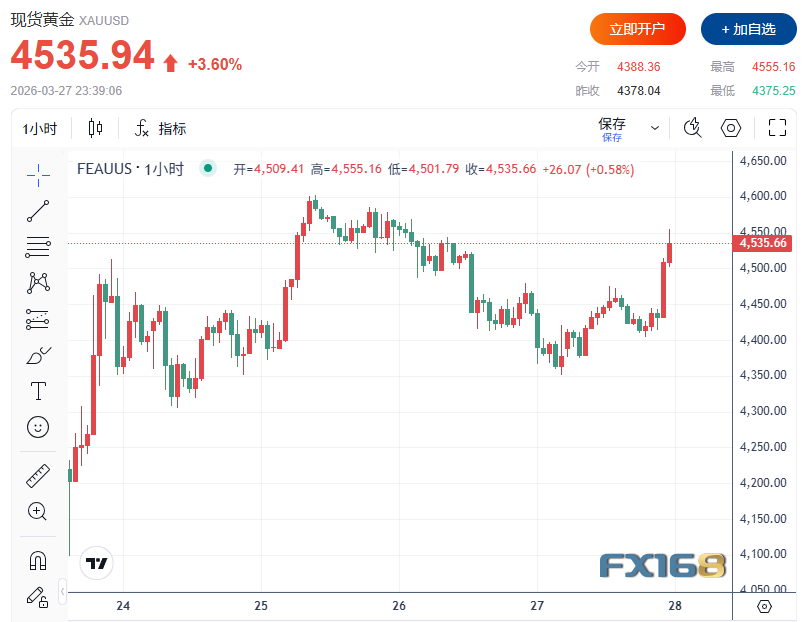 FX168財經報社(北美)訊 黃金週五(3月27日)小幅反彈,在前一交易日大跌近2.75%後暫時企穩。 隨着美國、以色列與伊朗相關地緣政治消息持續變化,全球市場波動加劇,黃金走勢也反覆震盪。