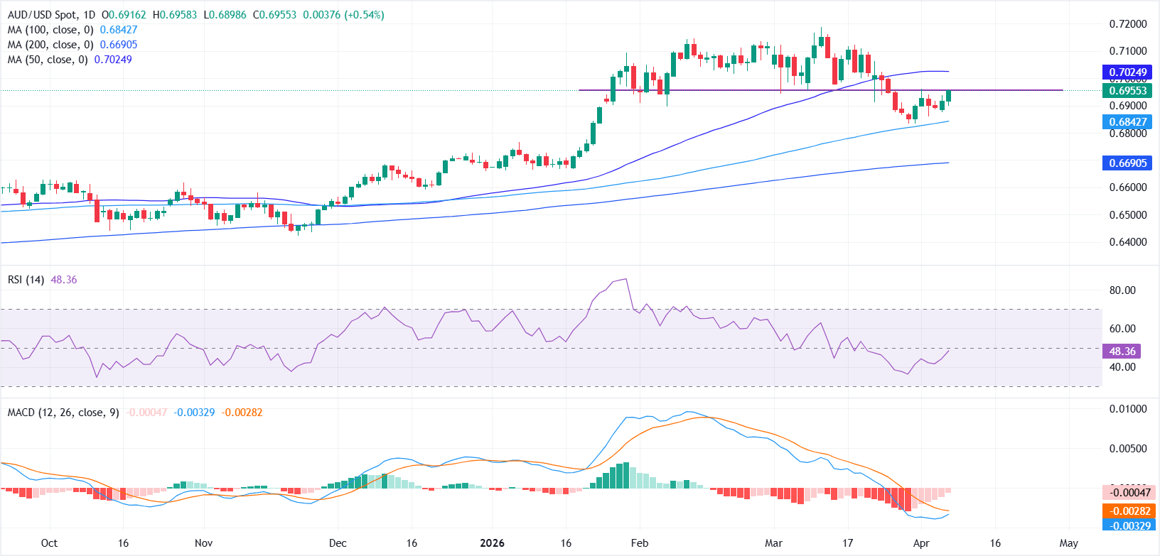 從技術角度看,日線圖顯示澳元/美元在100日簡單移動均線(SMA)0.6842上方獲得支撐後,嘗試溫和回升。該貨幣對目前正在測試0.6950水平,該水平此前為關鍵支撐位,現在成為即時阻力位。