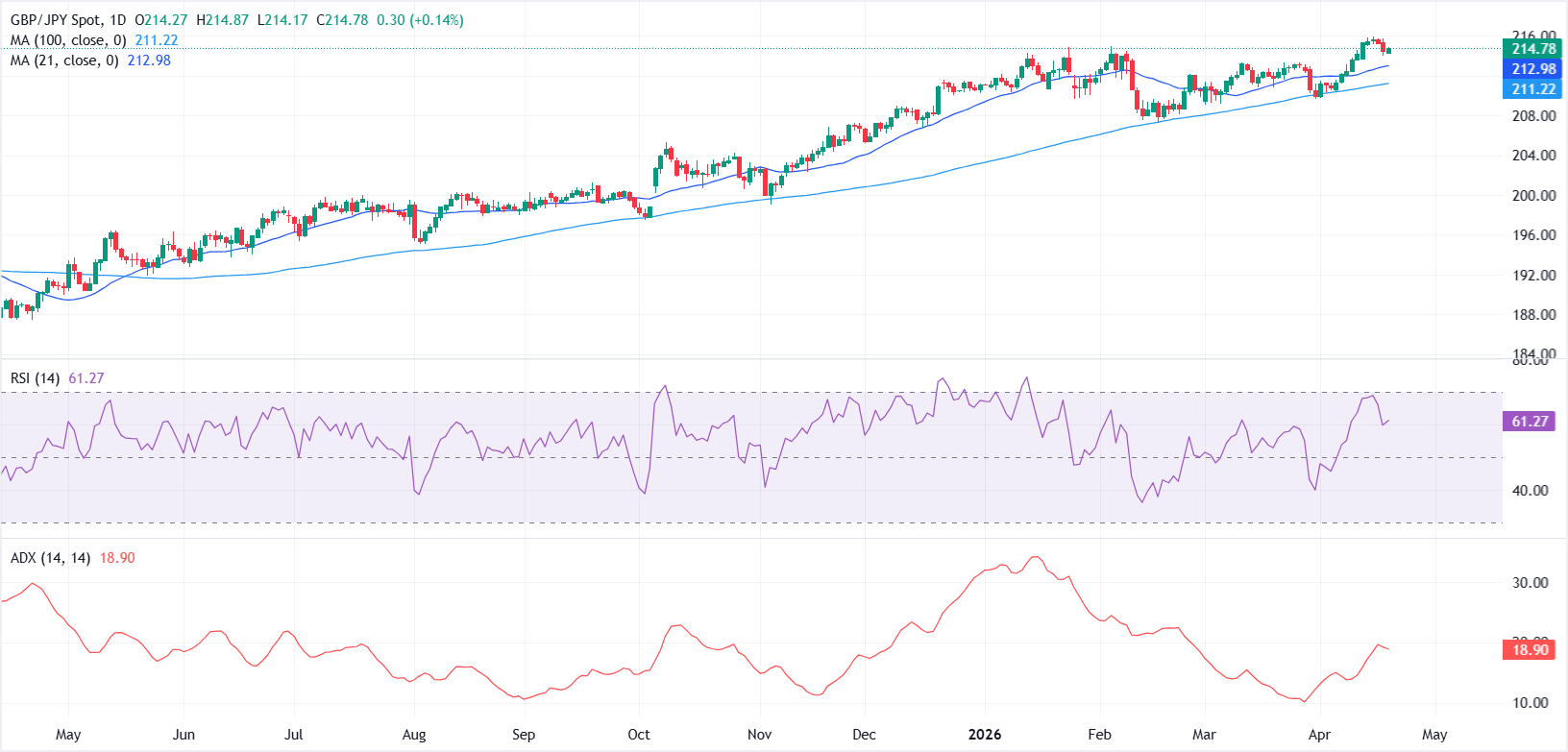 下方初步支撐位於21日SMA約212.98,若獲利回吐加速,100日SMA附近211.21將成為更深的修正支撐。只要該貨幣對維持在這些均線支撐之上,技術面仍偏向進一步上漲,任何回落至213.00–211.00區間預計將吸引買盤,而非標誌著趨勢的全面反轉。