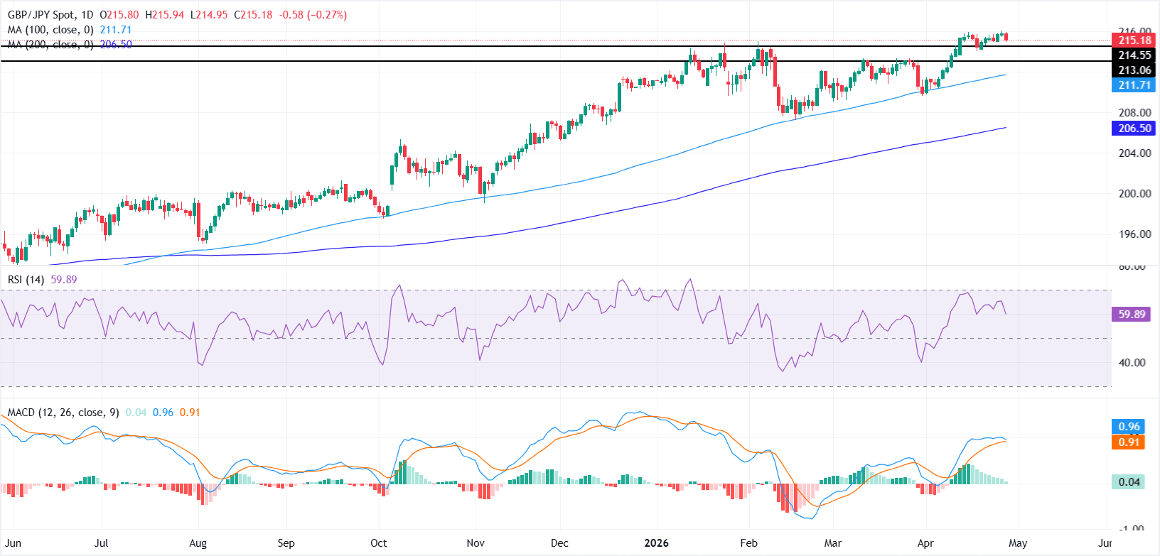 上方阻力位於216.00關口。若日線收盤價突破該水平,可能開啟延續當前上升趨勢的大門,上行目標分別為217.00和218.00。