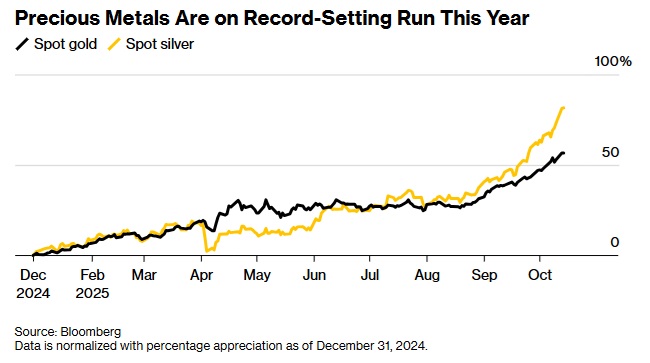 今年以來,四種主要貴金屬價格漲幅介於56%至81%,這波漲勢主導了大宗商品市場。黃金的上漲得益於央行購金、交易所交易基金(ETF)持倉增加以及美聯儲降息。中美貿易緊張局勢的反覆出現、美聯儲獨立性受到威脅以及美國政府關門也助長對避險資產的需求。