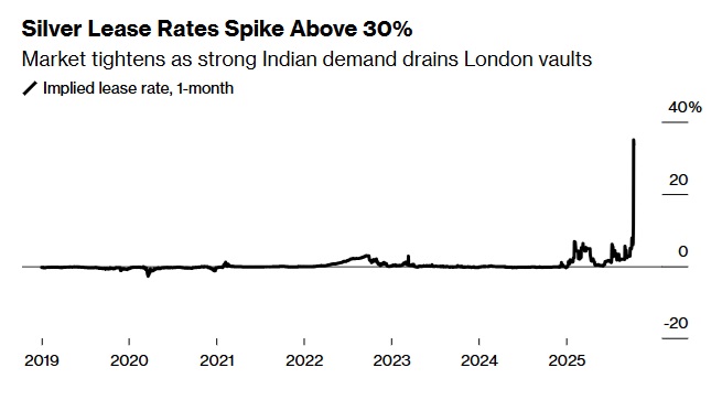 倫敦市場反映借入白銀年化成本的「白銀租借利率」,一個月期合約曾在上週五飆升至30%以上,這導致想延展空頭頭寸的投資者面臨令人咋舌的成本。