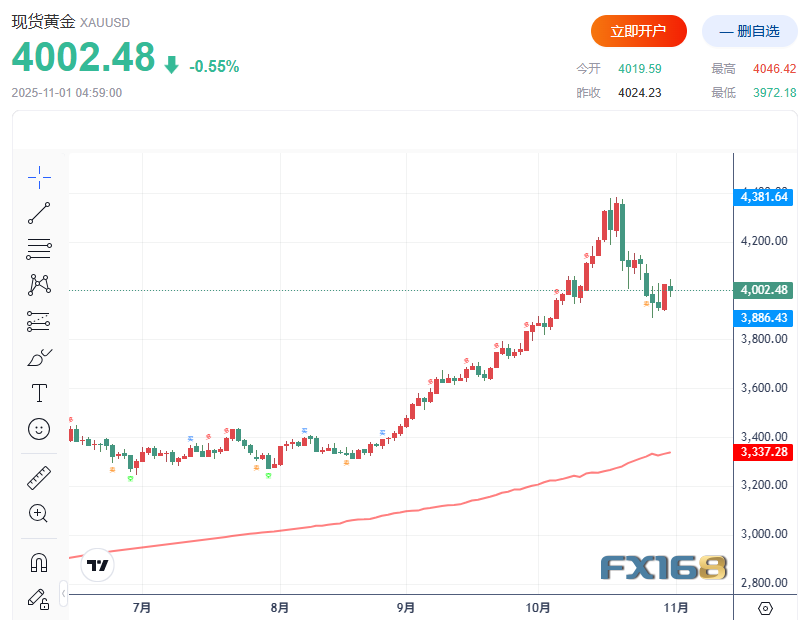 週五(10月31日),現貨黃金收報4002.48美元/盎司,本週下跌110.67美元,跌幅達2.68%。