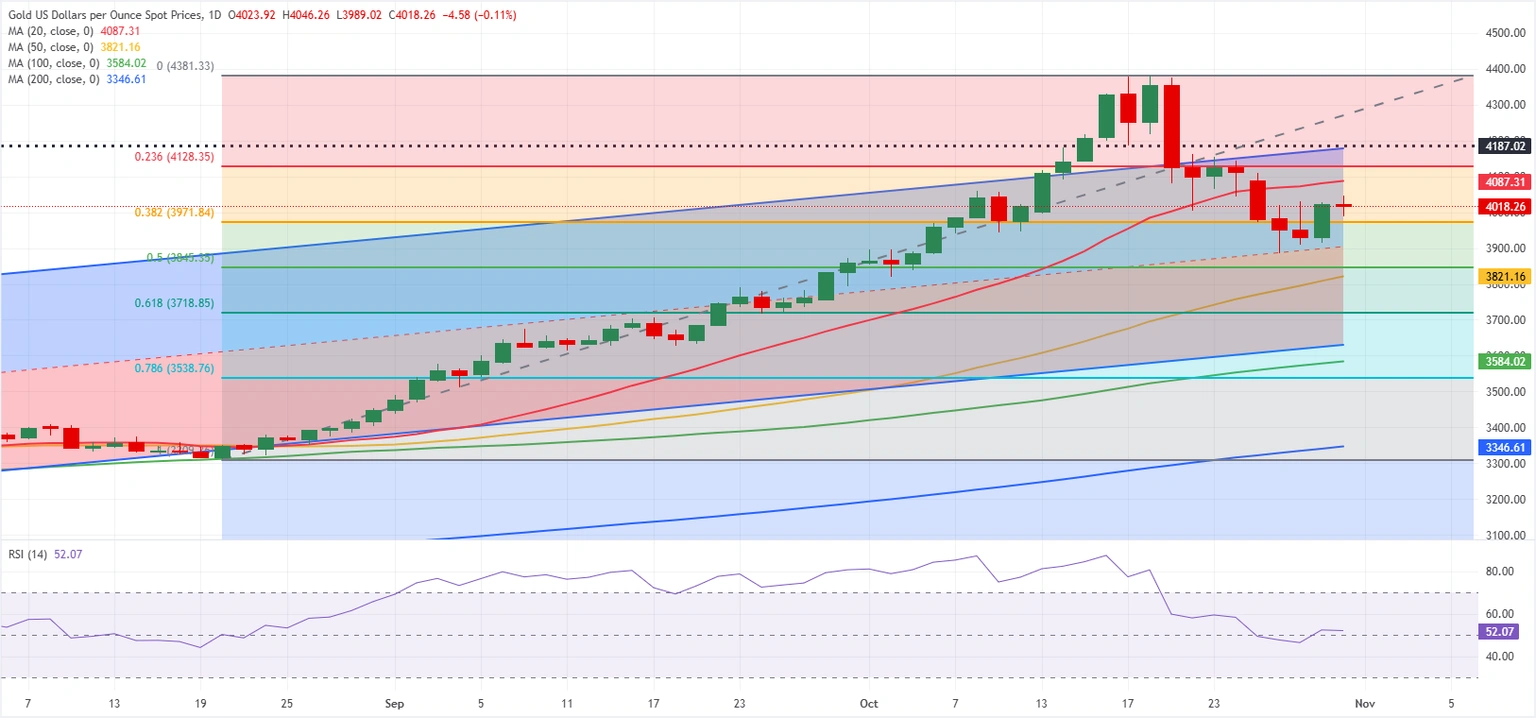 支撐位: 3970美元(38.2%回撤位)、3900美元(通道中樞)以及3850–3820美元(50%回撤與50日均線)。