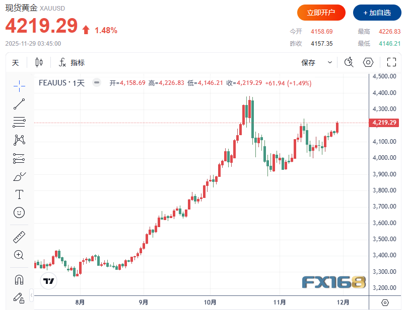 週五美市尾盤,現貨黃金上漲 1.48% 至 4,219.29 美元/盎司,盤中最高觸及 4,226.83 美元/盎司,本週漲幅達 3.80%或154.39美元,11月份上漲 5.42% 或 216.81美元,連續第四個月上漲。