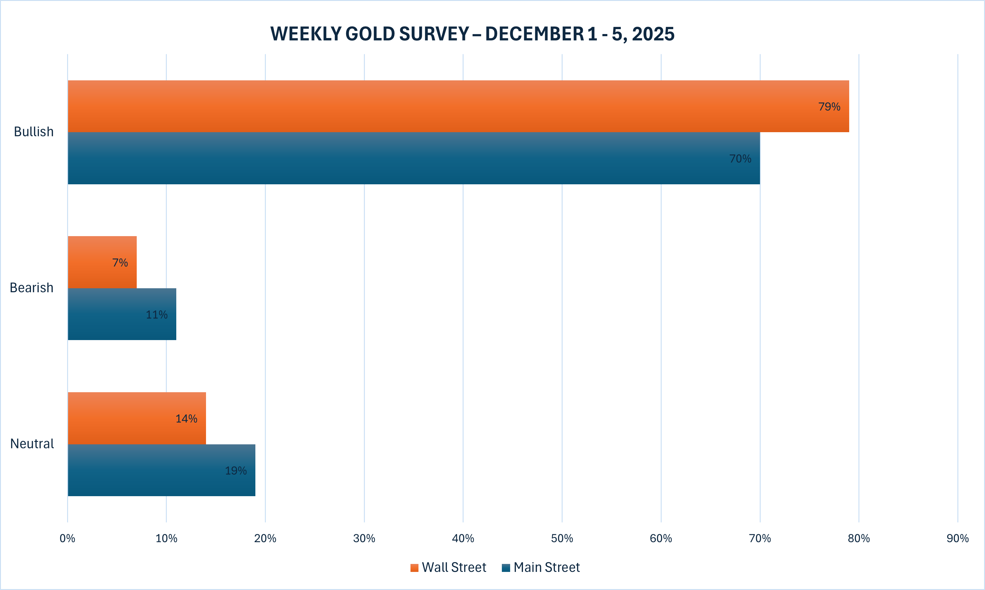 散戶投資者的情緒同樣顯著轉多。在 260 名接受調查的投資者中,有 183 人認爲黃金下週會繼續上漲,僅有 29 人預測金價將回落,其餘受訪者則預期市場走勢將以震盪爲主。