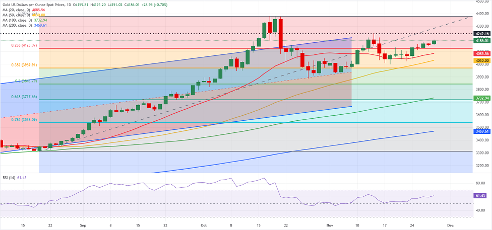 Sengezer指出,技術面展望指出短期內呈現看漲態勢。從日線圖來看,金價穩定地維持在20日簡單移動平均線(SMA)和8月-10月上漲趨勢的23.6%斐波那契回撤位(位於4125美元/盎司)之上。此外,相對強弱指數(RSI)在60附近橫盤整理。