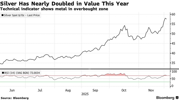 24K99訊 週二(12月2日)亞市盤中,白銀從紀錄高位大幅回落,一項關鍵技術指標顯示,連續六個交易日的上漲已將這種銀價推入超買區間。黃金價格週二亞市也走低。