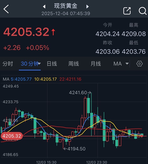 截至週三收盤,現貨黃金收報4203.06美元/盎司,日內微跌近0.1%。