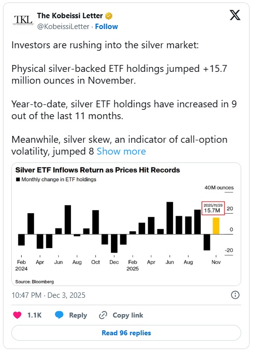 這一輪上漲並不令人意外,因爲白銀正吸引大量投資者需求:11月份,以實物白銀爲支撐的ETF增持1,570萬盎司,並且在過去11個月中有9個月出現資金淨流入。