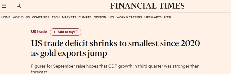 Pantheon Macroeconomics高級美國經濟學家Oliver Allen稱,他預計黃金金條出口的大幅跳升「幾乎肯定會在第四季度回落」,因此9月貿易逆差的下降「說明不了太多問題」。
