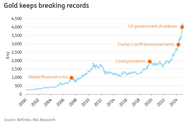 她寫道:「在全球金融危機之後,金價突破了1000美元/盎司。在新冠疫情期間,黃金上漲至2000美元/盎司。然後,在特朗普宣佈關稅時,它突破了3000美元/盎司關口。在最近美國政府長期停擺期間,黃金突破了4000美元/盎司。」