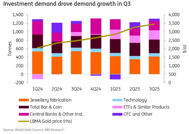 ETF投資者將222噸黃金加入其持倉,成爲近年來最大單季度流入,同時金條和金幣的需求仍然強勁,達到了316噸。