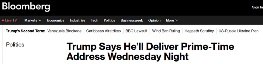 特朗普週二在一則社交媒體帖文中宣佈:「我的美國同胞們:我將於明晚在美國東部時間晚上9點,從白宮進行面向全國的講話直播。期待到時‘見到’你們。今年對我們國家來說是偉大的一年,最好的還在後頭!」